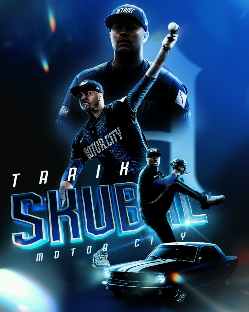 This sports graphic design is of the Left Hand Pitcher, Tarik Skubal of the Detroit Tigers (MLB). This composition highlights the Tigers’ city connect uniforms, which connect the city of Detroit to its history in car production “Motor City.” This composition uses colors and glows of blue to highlight these features of the jersey. A 3D text of ‘Skubal’ can be found, providing light to the composition, bringing everything together. Additionally, the Ford car can be found in the foreground of the composition representing the history of Ford production in Detroit.